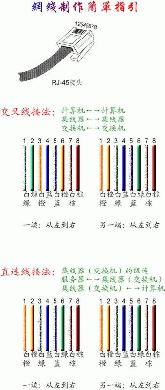 标准568B:橙白--1,橙--2,绿白--3,蓝--4,蓝白--5,绿--6,棕白--7,棕--8